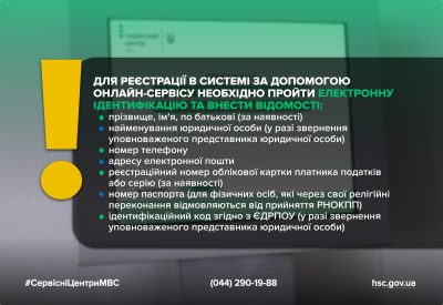Для реєстрації в системі за допомогою онлайн-сервісу необхідно пройти електронну ідентифікацію та внести відомості: