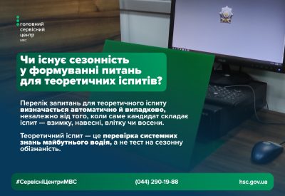Система формування екзаменаційних білетів працює за єдиним принципом упродовж усього року. Незалежно від того, коли саме кандидат складає іспит — взимку, навесні, влітку чи восени — перелік запитань визначається автоматично з усього банку тестових завдань без урахування погодних чи сезонних умов.